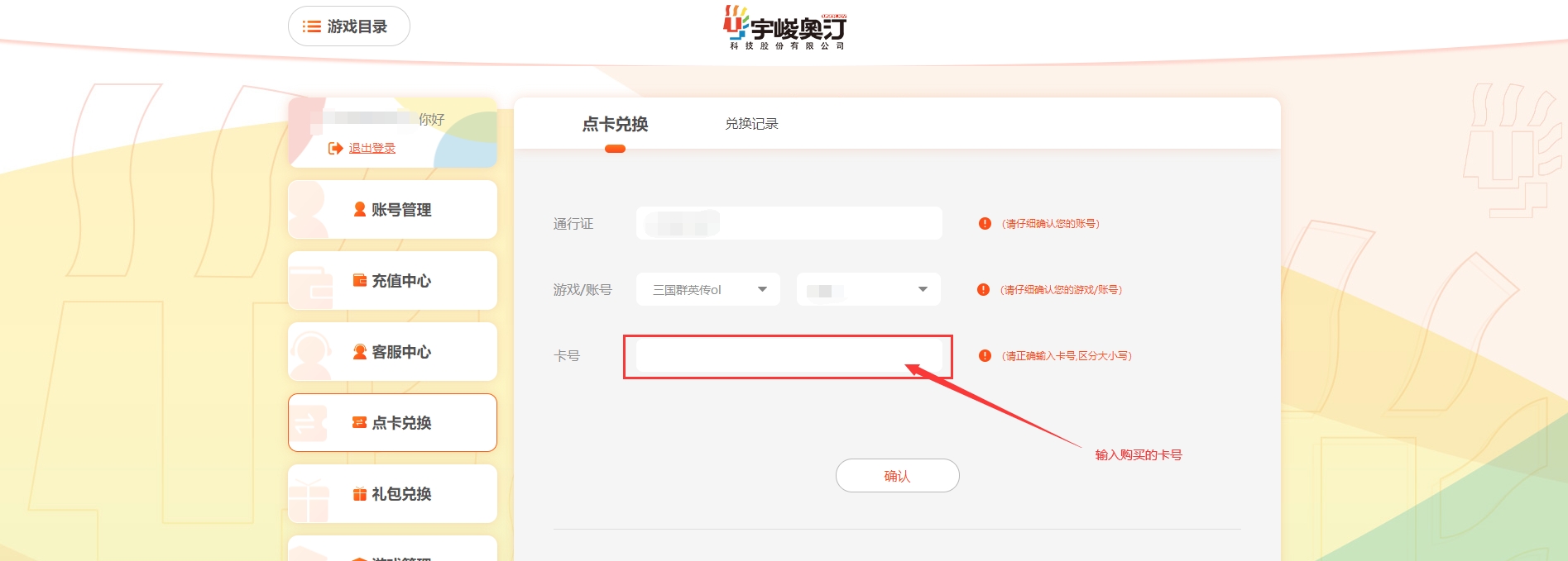 第二步:点击左侧点卡兑换按钮,输入卡号,选择正确游戏、账号后点击确认提交,即完成充值